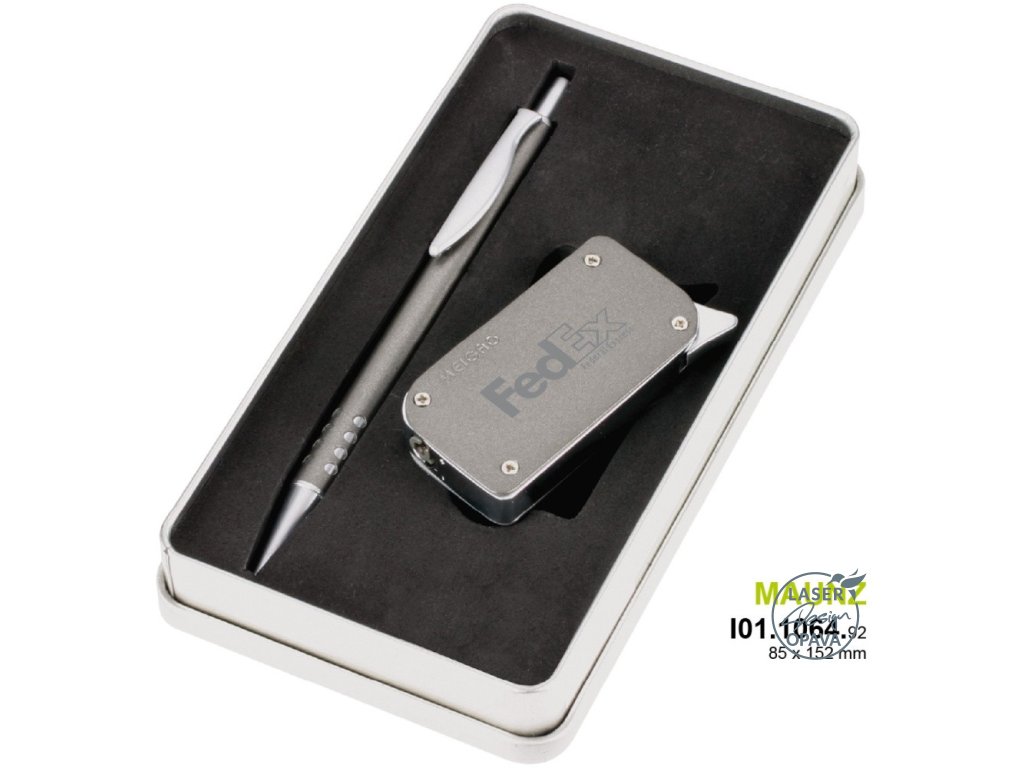 II. jakost - lehce poškozený box. Kuličkové pero a zapalovač.